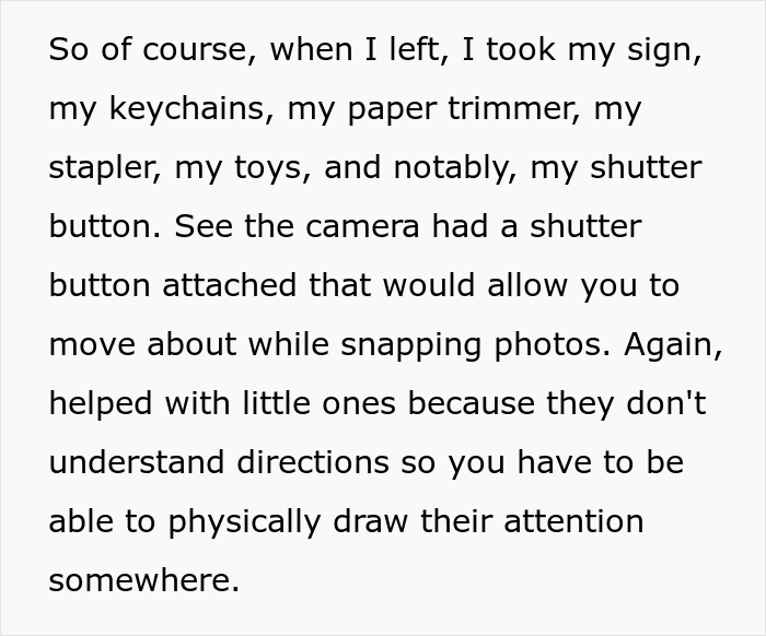 OP’s hard work manifested in many ways, and so it was time to undo all of it. Long story short, deposit money was left unaccounted for (making the manager come in, even on days off, to do it); they stopped actively looking for clients, cold calling, and the like; they stopped taking notes about customers (reminders and whatnot); OP packed all of the toys they brought in for kids’ photo shoots because you can imagine how cooperative kids are and how posing works with them; and packed all of the other small things that OP decide to replace after they broke that were easier fixed personally rather than involving official channels (staplers, cutters, cables, and loads more).
