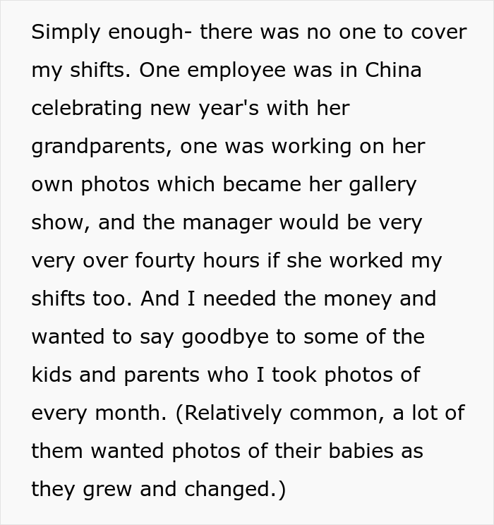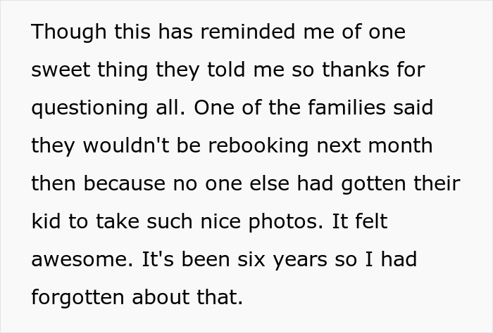 Complaint #2 was even more ridiculous. The customer felt like OP was too bossy with this one other photographer. The one they were training. In reality, they were just telling her what to do because she didn’t know the ropes yet.