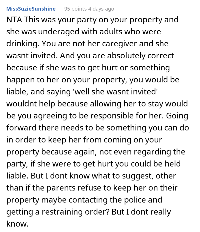 Their intellectually disabled neighbor showed up uninvited and started mingling with the guests. The woman and her husband contacted her parents and asked them to pick her up, but they didn’t see a problem that their daughter was among a group of drinking strangers, and thought the couple were being too egoistic, robbing her of a good time.