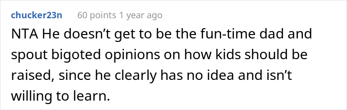 While he thought that he did the right thing, the man’s girlfriend thought that there was no need to tell the boy’s dad such things. Because of this reason, he decided to share this story with others online and see some other opinions on the situation. A lot of users agreed with the man’s actions and were quite outraged seeing that the man who at first didn’t even bother to take proper care of his son now suddenly had such a strong opinion on how he wanted his kid to be raised.