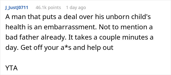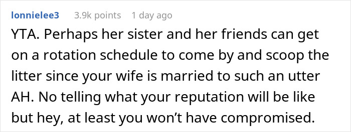 Recently, his wife got pregnant and asked the man to cover one of her responsibilities—cleaning her cat’s litter box. But mozzz22 was adamant. He told her there was no way he was going to pick up the trowel and suggested giving up the pet instead.