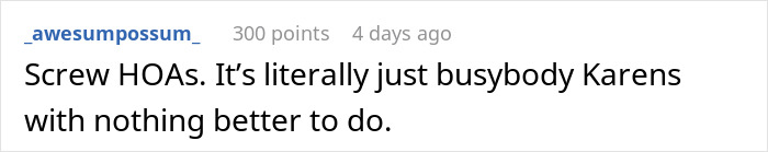 The post Person Maliciously Complies With HOA Rules, Ends Up Costing Them 16% Of The HOA Income first appeared on Bored Panda.