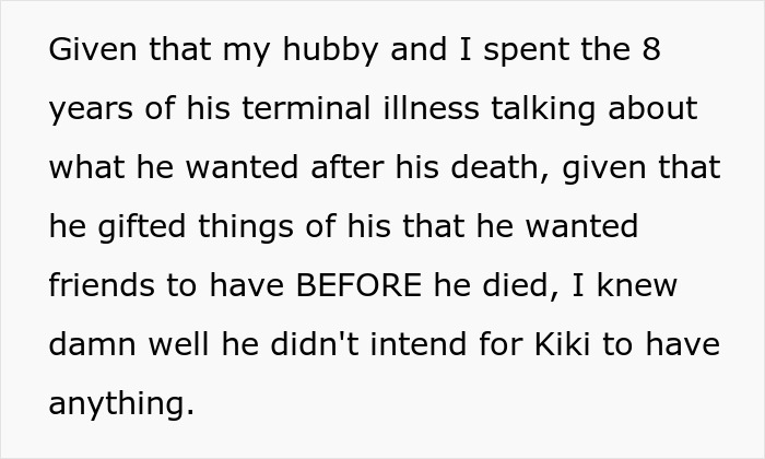 Redditor u/MorriganNiConn, whose husband passed away two years ago, shared a story with the r/pettyrevenge online community about her good friend’s daughter, ‘Kiki,’ who started talking about her ‘promised’ inheritance. The OP knew that her late husband didn’t leave Kiki anything, so she came up with a plan to teach the young woman a lesson she’d never forget. You’ll find the full story as you scroll down. Bored Panda has reached out to u/MorriganNiConn via Reddit, and we will update the article as soon as we hear back from her.