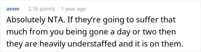 In the long run, repeated use of these techniques will end with the employee hating their toxic work environment and looking for a way out. As we see in this story, sometimes there is just one incident too many that pushes the employee to resign. Often, smaller organizations are more susceptible to this sort of manipulation. You might work closely with your boss more often, allowing them to convince you that you are perhaps friends. Smaller organizations can more often claim to be understaffed or less flexible than larger companies. All in all, always remember that your job is not your family, particularly in cases like this when the actual family is involved.