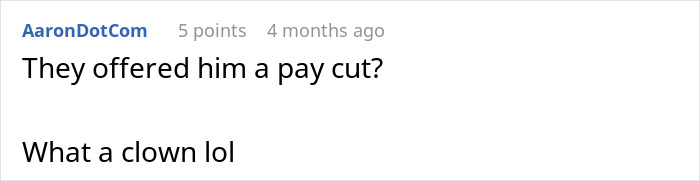 Fast forward a few weeks and the CEO of the company, ‘John,’ got in touch with Tim about him possibly coming back to the company. However, what the boss was offering the senior programmer wasn’t really fair: a 20% pay cut as a way to adjust for his lower cost of living outside of NYC. Having your pay slashed by a fifth for providing the same level of work is ridiculous.