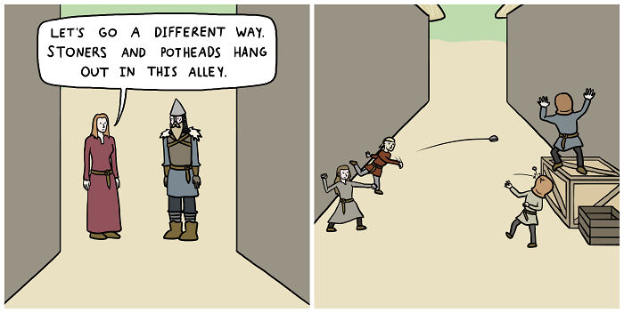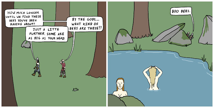 My process for creating my comics is pretty simple: take a pun, then write a brief story around it. I have a (somewhat lengthy) list of puns I've collected over the years that I've either come up with myself during random occasions or have heard in an old joke. It's probably not the most effective way of doing things, but it's been working out so far! It does get trickier when I want to write a multi-part story, since each pun has to relate to the overarching story in some way. That's all part of the fun though, and it feels very rewarding once something finally comes together. My favorite pun I've used in a comic still might be the very first Comedy Viking comic I ever wrote, where Lars asks if an elderly woman can see that well, then naturally, she falls into a well.