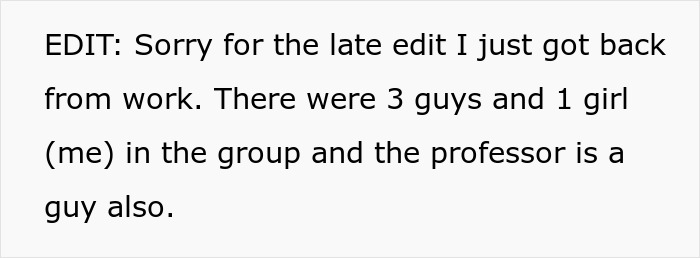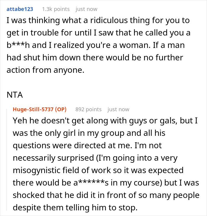 As for the commenters on this story, people massively sided with the original poster, finding her fellow student’s behavior completely outrageous and inappropriate. Moreover, he had more than once allowed himself such antics with different people. And commenters believe that the professor was also wrong in forcing the girl to apologize, and urged her not to leave the situation like this. “Skip the professor and go straight to administration. This behavior is abhorrent,” someone wrote in the comments.