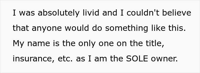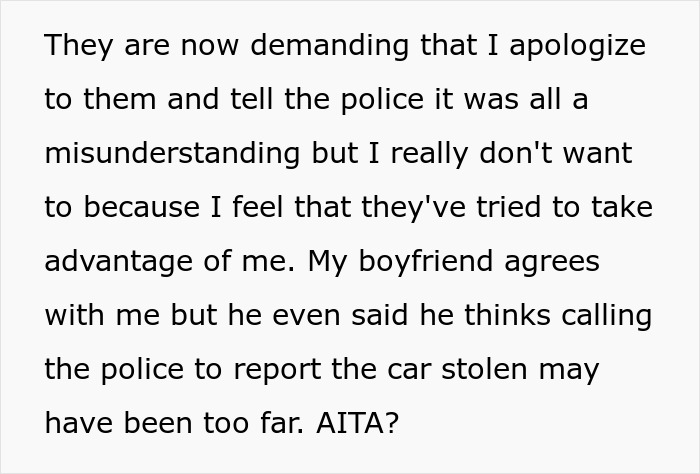 Even a phone call to the sister didn’t manage to resolve anything. When she still wouldn’t get it back home, the OP had finally had enough and ended up calling the authorities and reported the car stolen. Now, her boyfriend’s family is absolutely livid and is demanding an apology. Most redditors, however, were on the car owner’s side. Some of them even suggested that she and her boyfriend move out of his dad’s place as soon as possible.