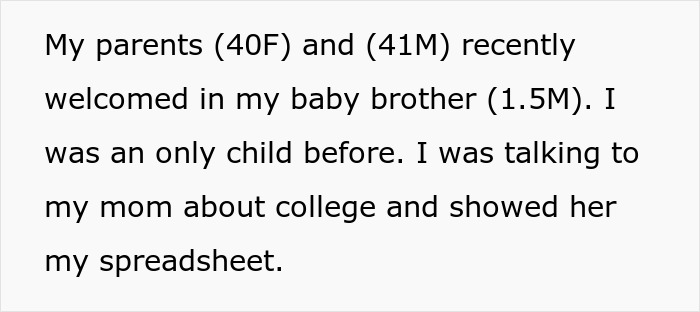 Now, after OP shared her spreadsheet with her mom, she was told that now she has to adjust the whole budget by half as they are planning to give her baby brother half of this money. The author was shocked as she was hoping to graduate with as little debt as possible; however, after these deductions, that is going to be harder to accomplish.