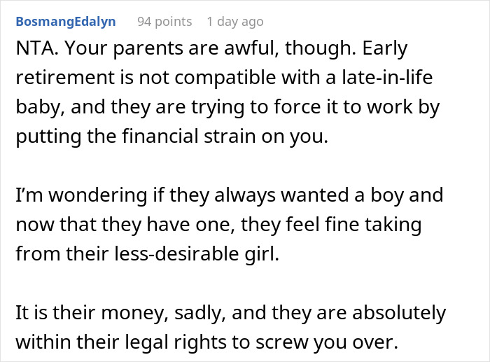 The community members gave the woman the ‘Not the A-hole’ verdict as it was not a nice move from the parents and OP has a valid reason to be upset. However, most folks also agreed that because it’s her parents’ money, there is not much to do. “It’s a real [jerk] move on their part to suddenly take away the funding they had promised you all along,” one user shared. “It’s their money and they can do what they like with it. But it’s still going back on a promise/deal with their child,” another agreed.