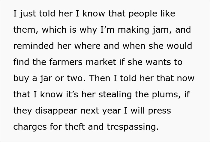 Well, one farmer learned that a neighboring woman could not resist and had been stealing her plums year after year and decided to share the tale with the internet. After catching her in the act, the thieving Karen had the audacity to yell at her and call her selfish. Readers had a field day mocking this entitled neighbor and sharing their own stories of people who really thought too much of themselves.
