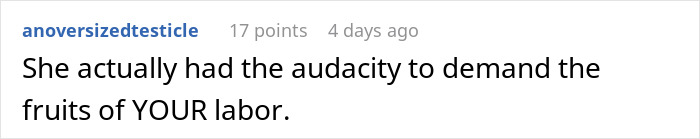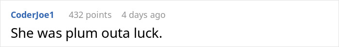 In general, what this woman and many of the world’s Karens have in common is a deep-seated and bewildering entitlement. When faced with the reality that the entire universe does not revolve around them, the response, as visible in this story, is to shoot the messenger. The “Karen” yells at OP, calls her selfish and no doubt made a somewhat ridiculous scene. This is a poor decision, as the plums were never her property in the first place, OP telling her this was just communicating something that had evidently been true for years.