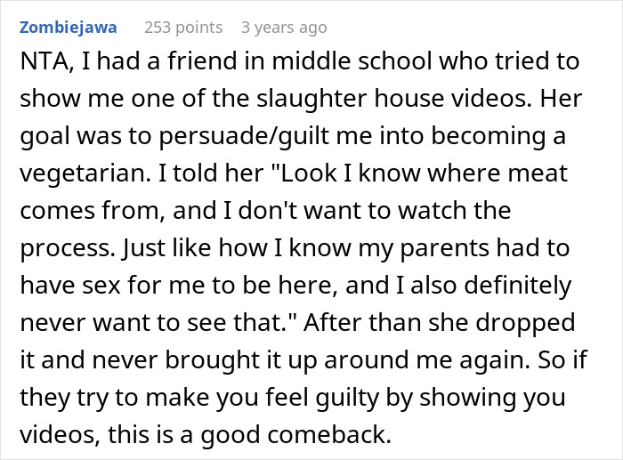 In any case, the original poster’s teenage sister is clearly more mature and balanced than her adult parents in this situation. And people in the comments also noted this. Moreover, many vegan commenters also wrote that the OP’s parents acted rudely and inappropriately here, because it’s their son’s body and his own choice to eat what he wants and prefers. And any aggressive imposition of one’s point of view is unacceptable here, commenters stated.
