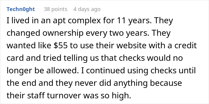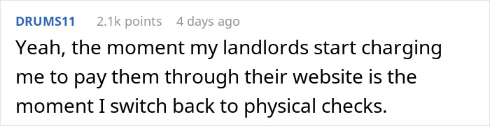 Fortunately, the author of this story found a clever way to not only avoid the extra charges but also make their rent payments more of a burden for the property manager