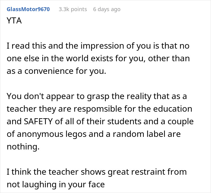 The mom ended up having to forbid any toy-taking after two particular things went missing: a LEGO creation set and a sticker. Both times, the mom claims that the teacher was rude after being asked to go look for them.